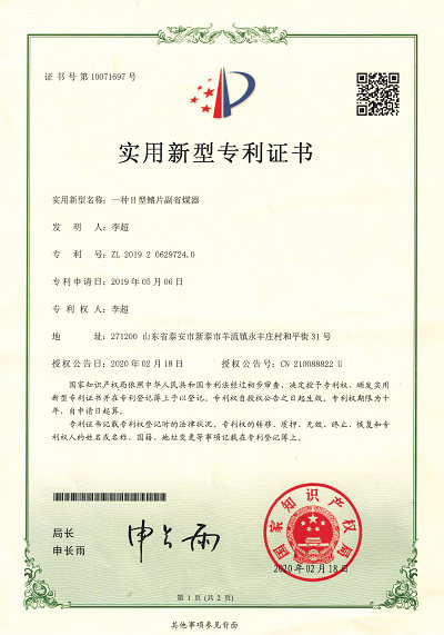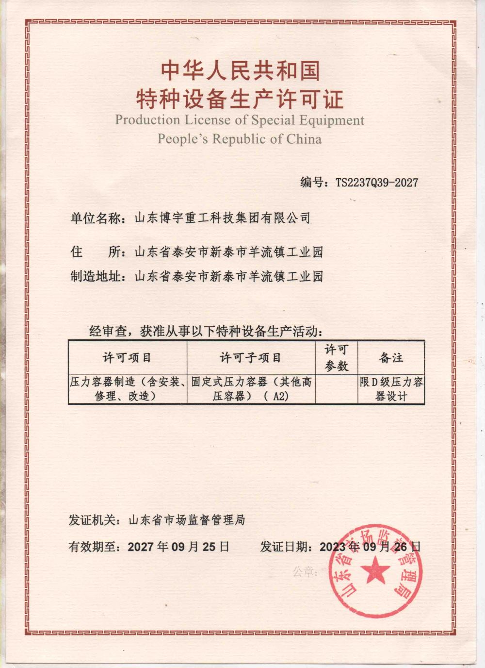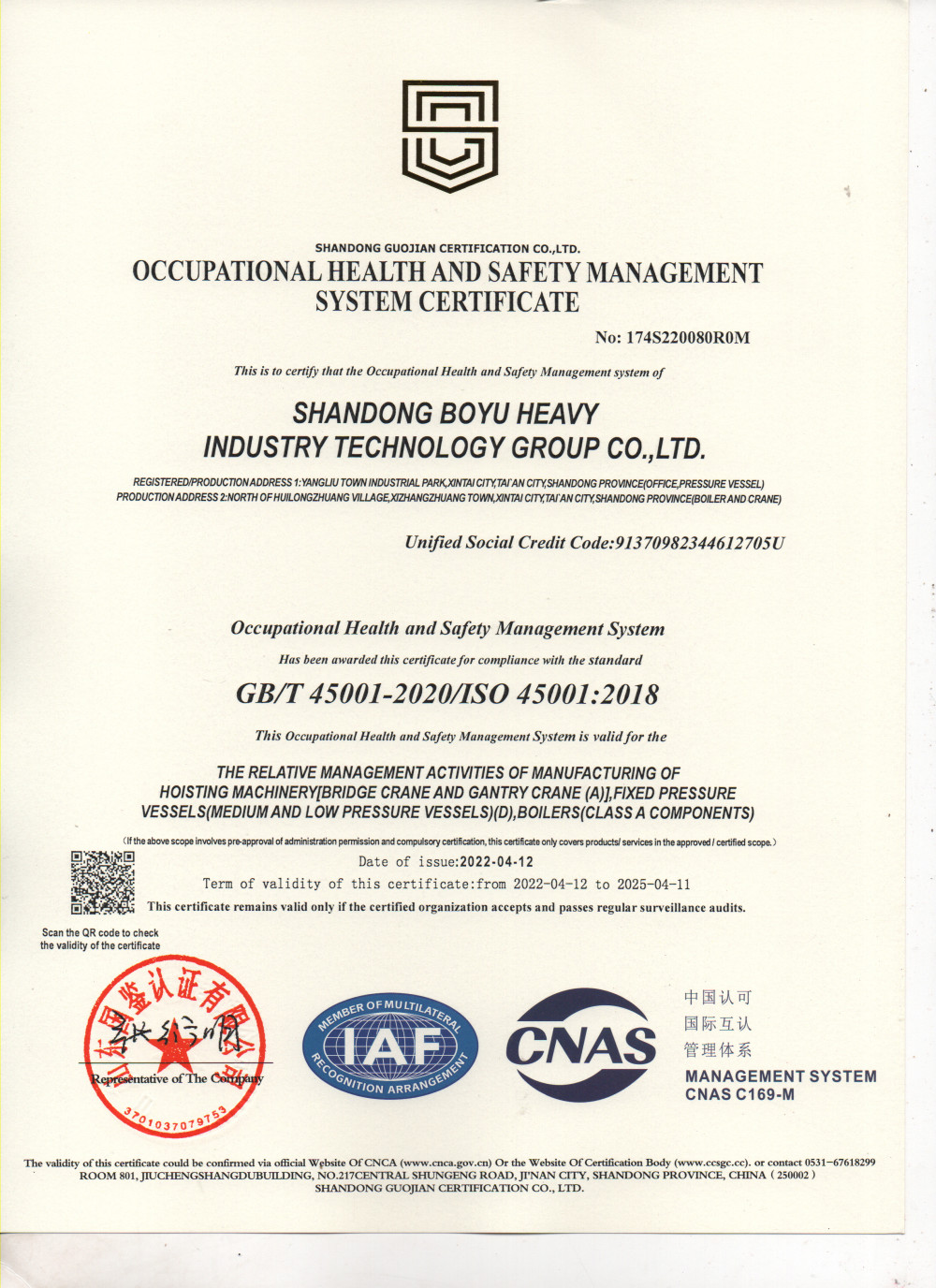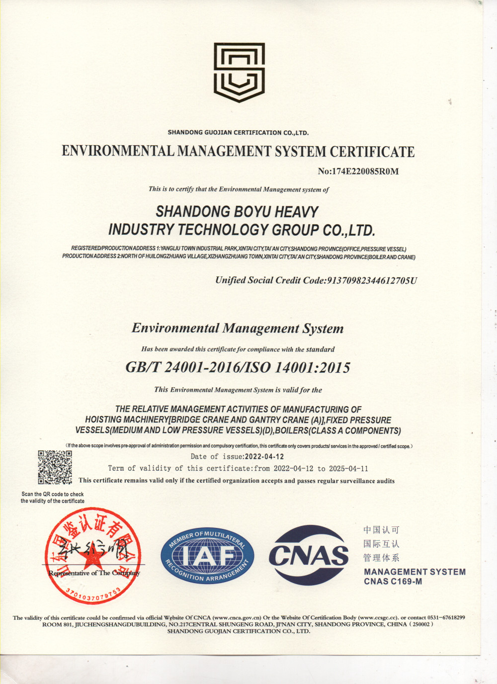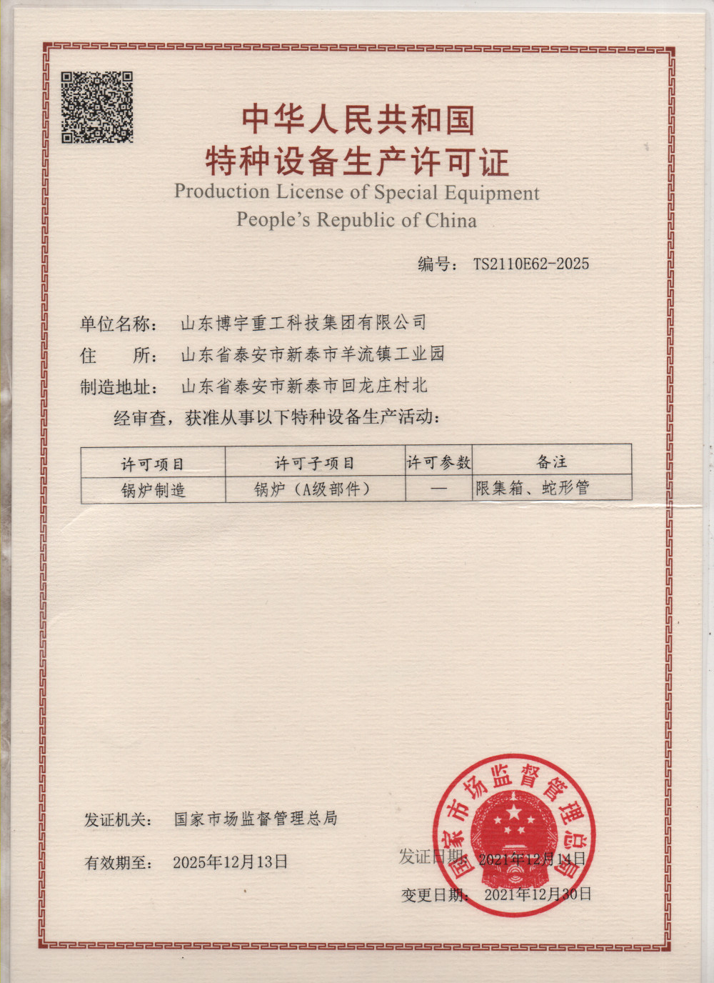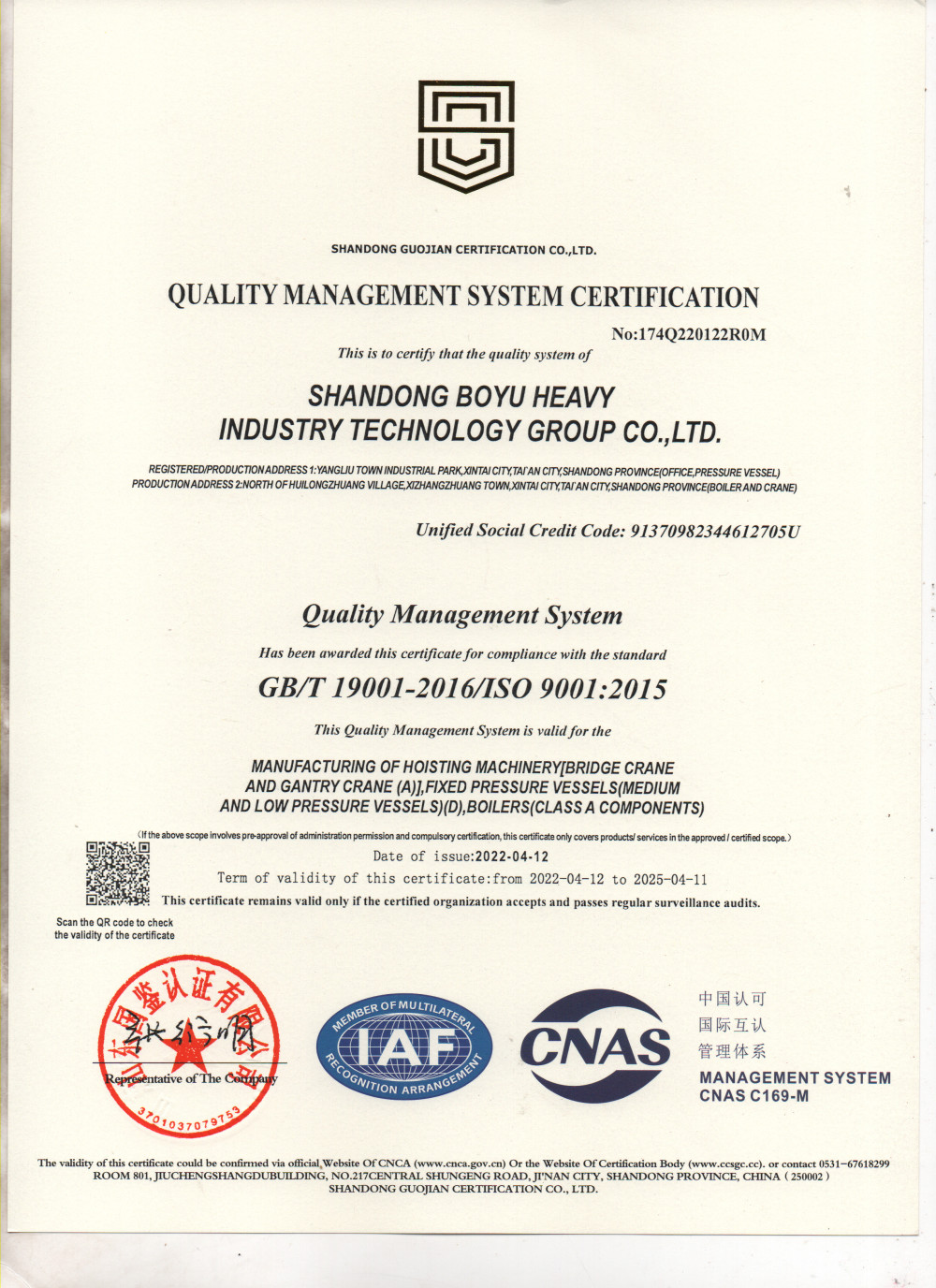 Компания применяет систему качества ISO9001 и режим управления безупречной производительностью GB/T19580, имеет лицензию на производство деталей котла класса A и лицензию на производство сосудов под давлением класса I и II. В ближайшем будущем она получит сертификаты на стальную марку для ASME"S" и "U" и уже получила лицензию на установку, модификацию и техническое обслуживание котла второго класса.